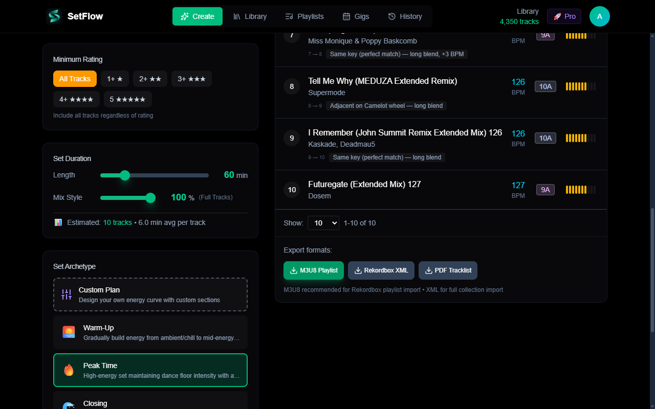 SetFlow has five built-in energy presets that match the classic structures described above: Journey, Peak Time, Warm-Up, Cool-Down, and Chill. When you generate a set, you choose the preset that fits your gig, and the algorithm matches tracks to that energy curve automatically.